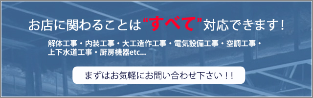 居抜き物件のちょっとした補修工事から、スケルトン物件などのゼロからの工事まで、内装工事の大小関わらず対応しております。プロ目線での空調設備や照明位置、従業員やお客様の動線も考え込んだプランニングを行います。また、改装時における厨房機器の搬入・設置工事もトータルで対応しておりますので、なんでも安心してご相談ください。 諸官庁申請・上下水道申請及び空調設備工事も自社で行います。